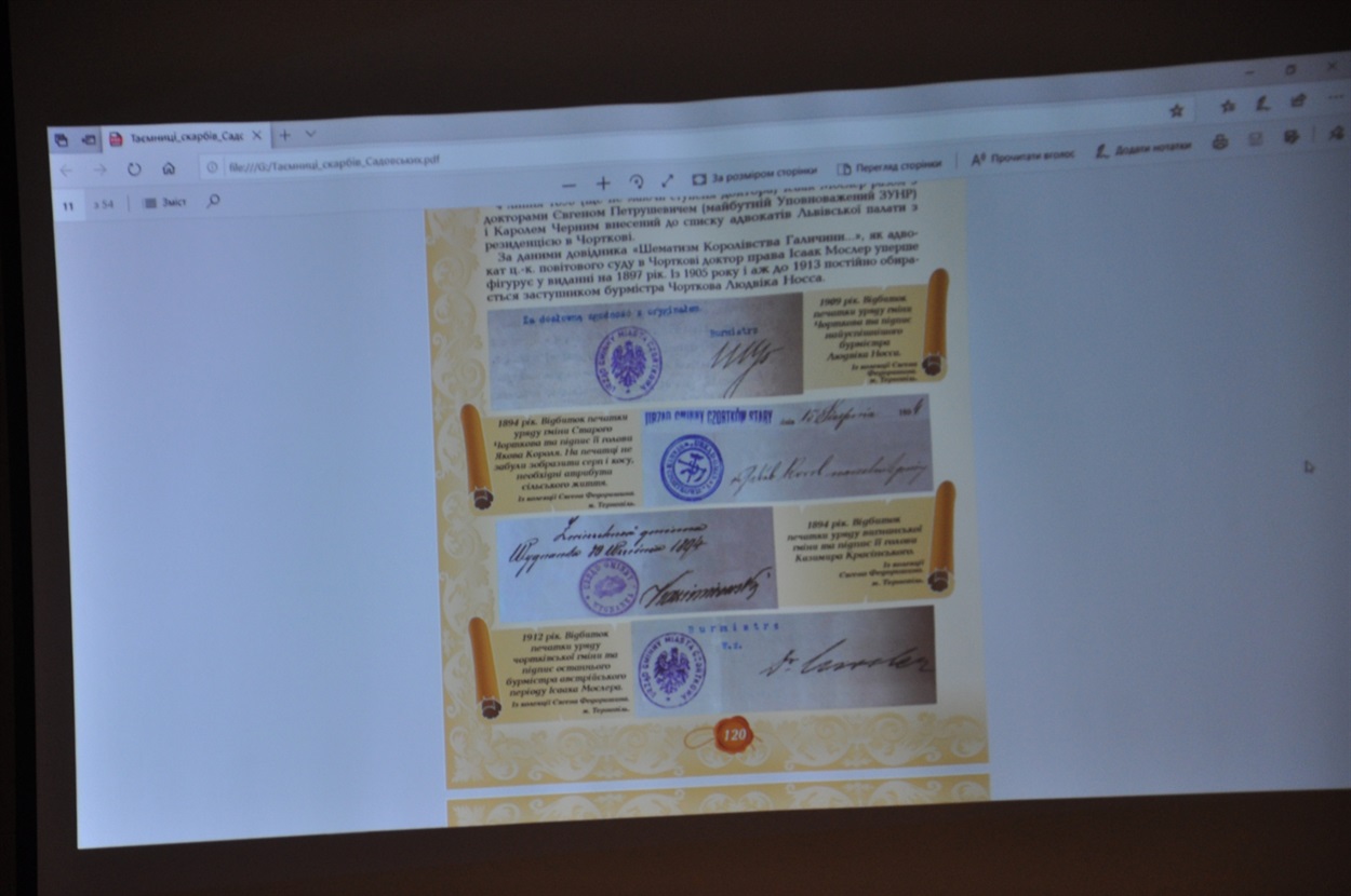 «Перший розділ «Хай святиться ім`я Твоє», – коментує зображення на екрані майбутньої книги Петро Федоришин, відкривається церквою Покрови Пресвятої Богородиці на Вигнанці. Гортаючи сторінки далі наступного розділу, ми бачимо першого депутата Галицького сейму від Чорткова Івана Карпинця (1861 р.). А так виглядали печатки цісарсько-королівських староств, перші чортківські марки, поштівки, листівки...»