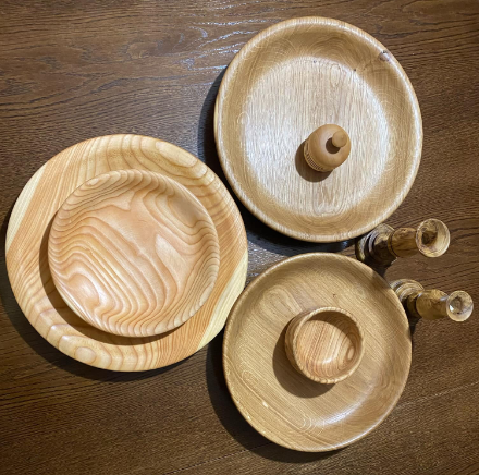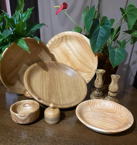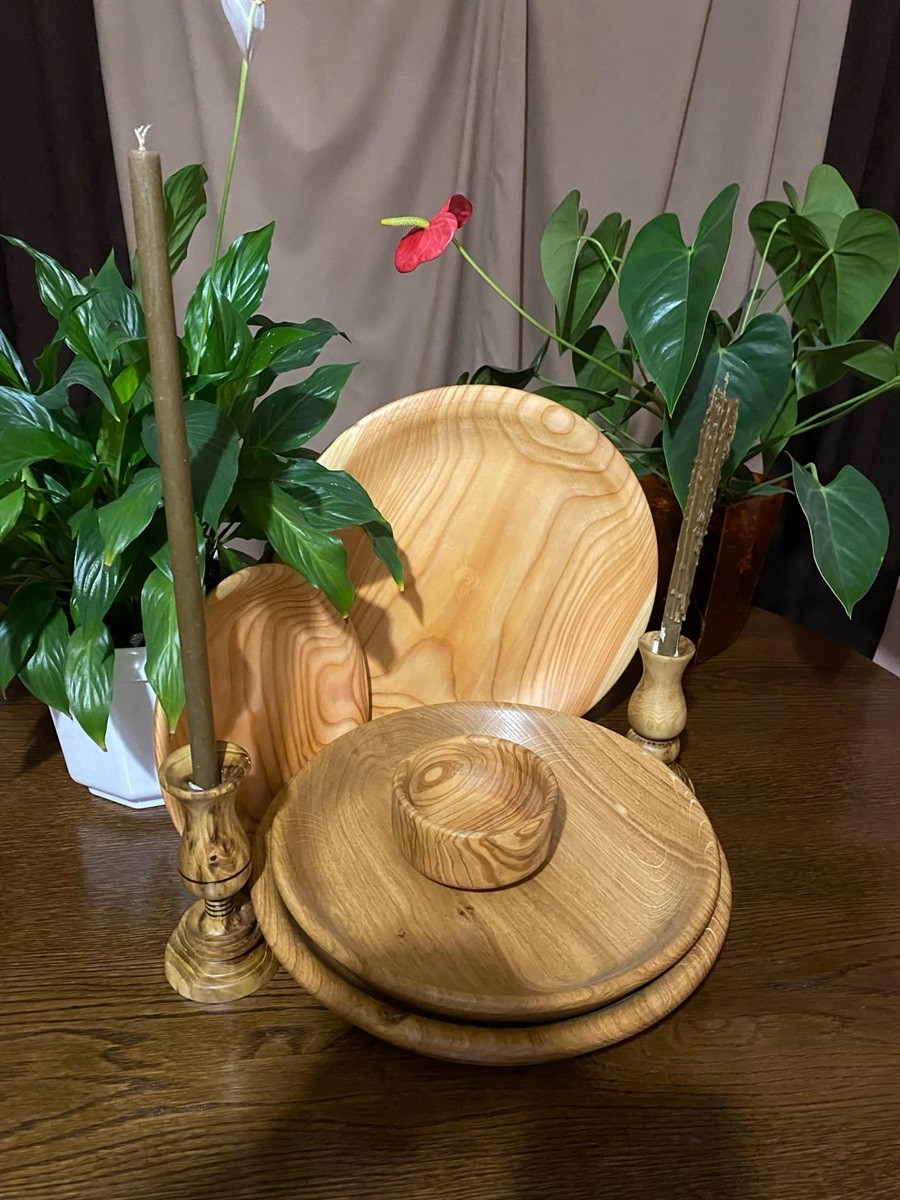 Виявляється, щоб зробити ось ці тарелі, миски, сільнички, підсвічники, треба докласти рук до окремих деревних порід, зокрема – груші, сливи, ясеня, дуба. Ну, й горіха, можливо, чи акації.