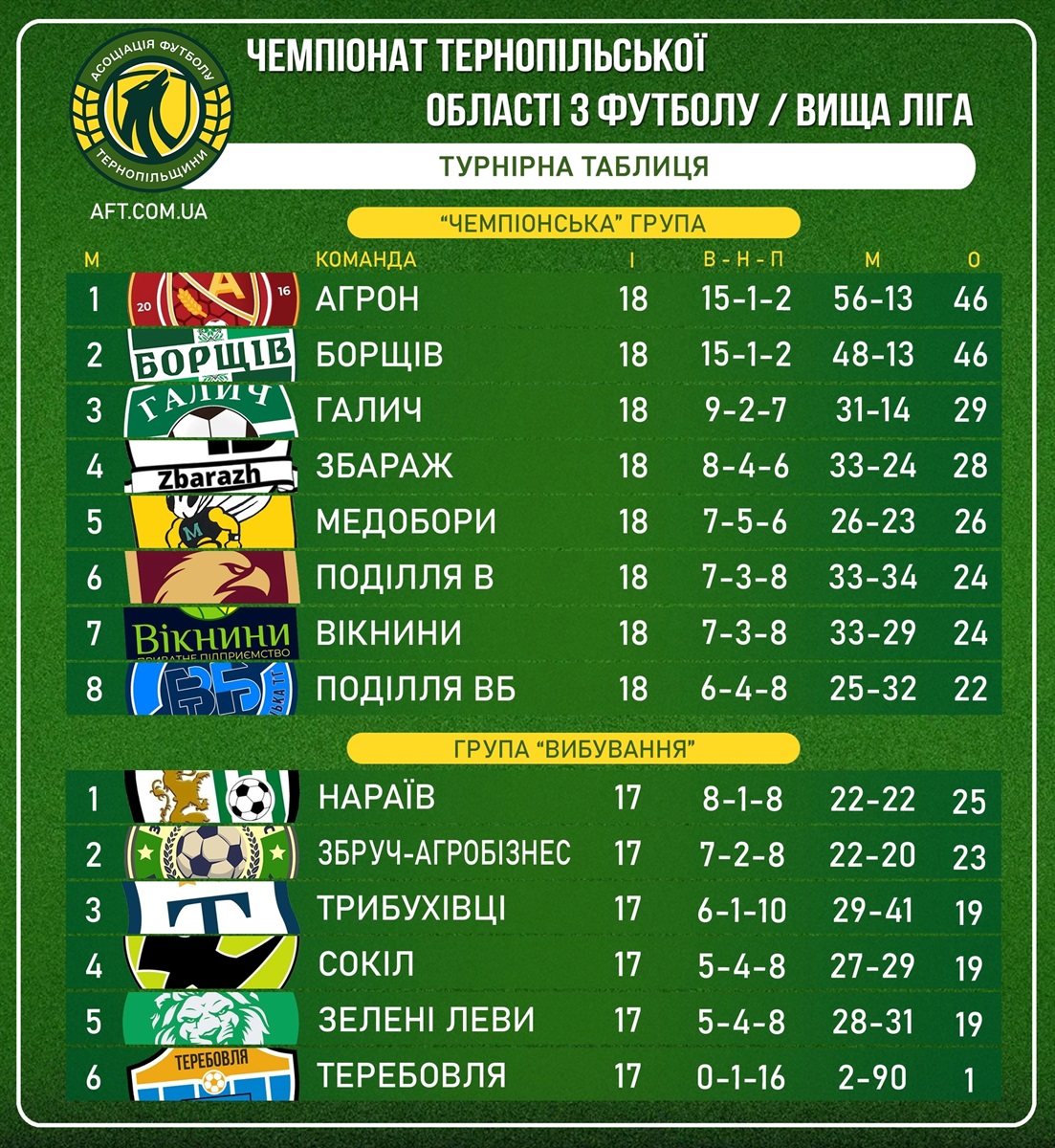 На жаль, у звітному турі борщів`яни потерпіли поразку з розгромним рахунком прямому конкуренту у боротьбі за золоті медалі обласної першості, поступившись Великим Гаям з великим рахунком 5:1 і помінявшись з ними місцями у турнірній таблиці. Набравши однакову кількість залікових пунктів, лише за забитими мячами «Агрон» випереджає представника Чортківщини. Тож боротьба за золото тут триватиме до останнього туру.
