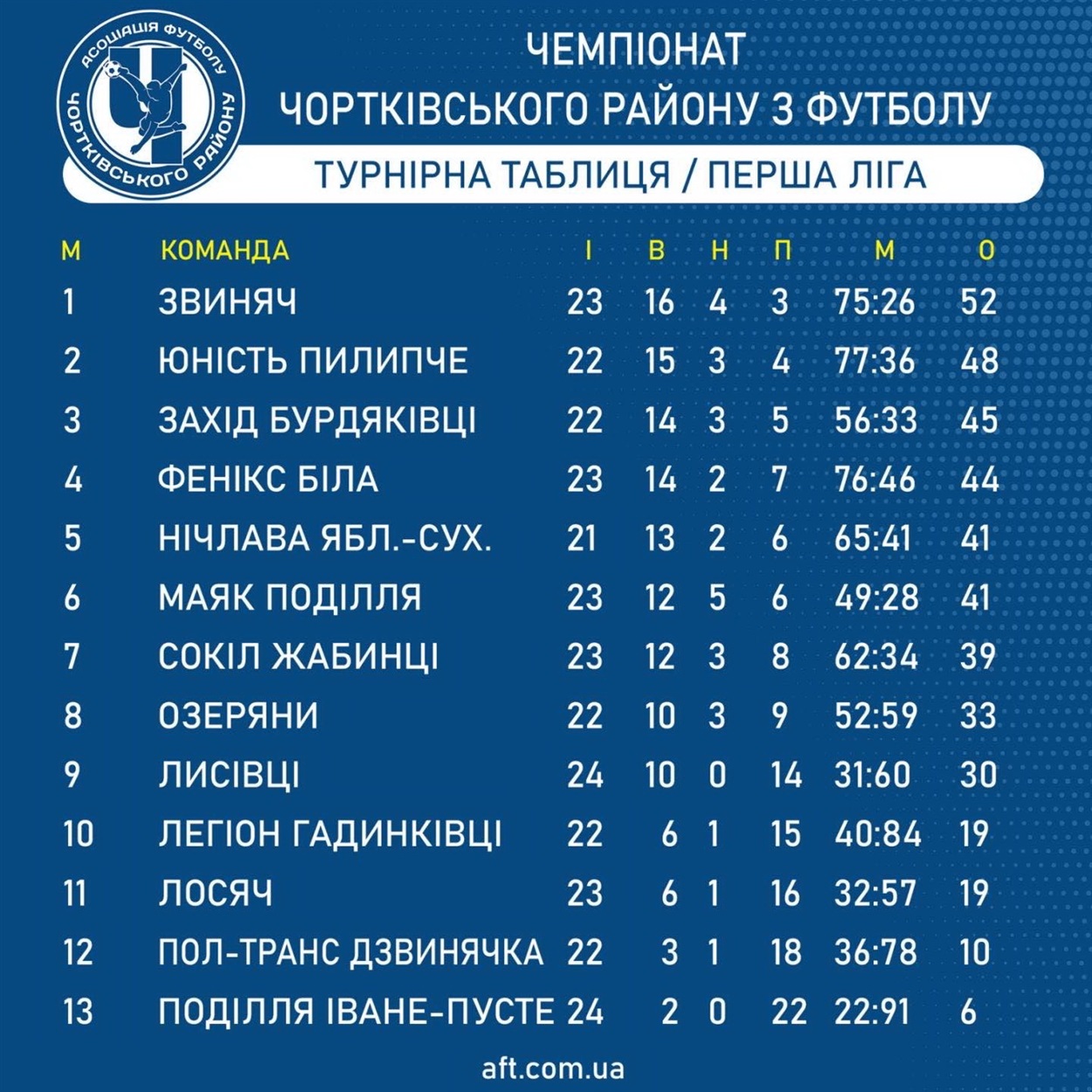 Перша ліга. 24-й тур. «Маяк» Поділля – ФК «Озеряни» – 4:2; «Захід» Бурдяківці – «Юність» Пилипче – 2:2; ФК «Звиняч» – «Легіон» Гадинківці – 13:0; «Пол-Транс» Дзвинячка – «Сокіл» Жабинці – 1:3.