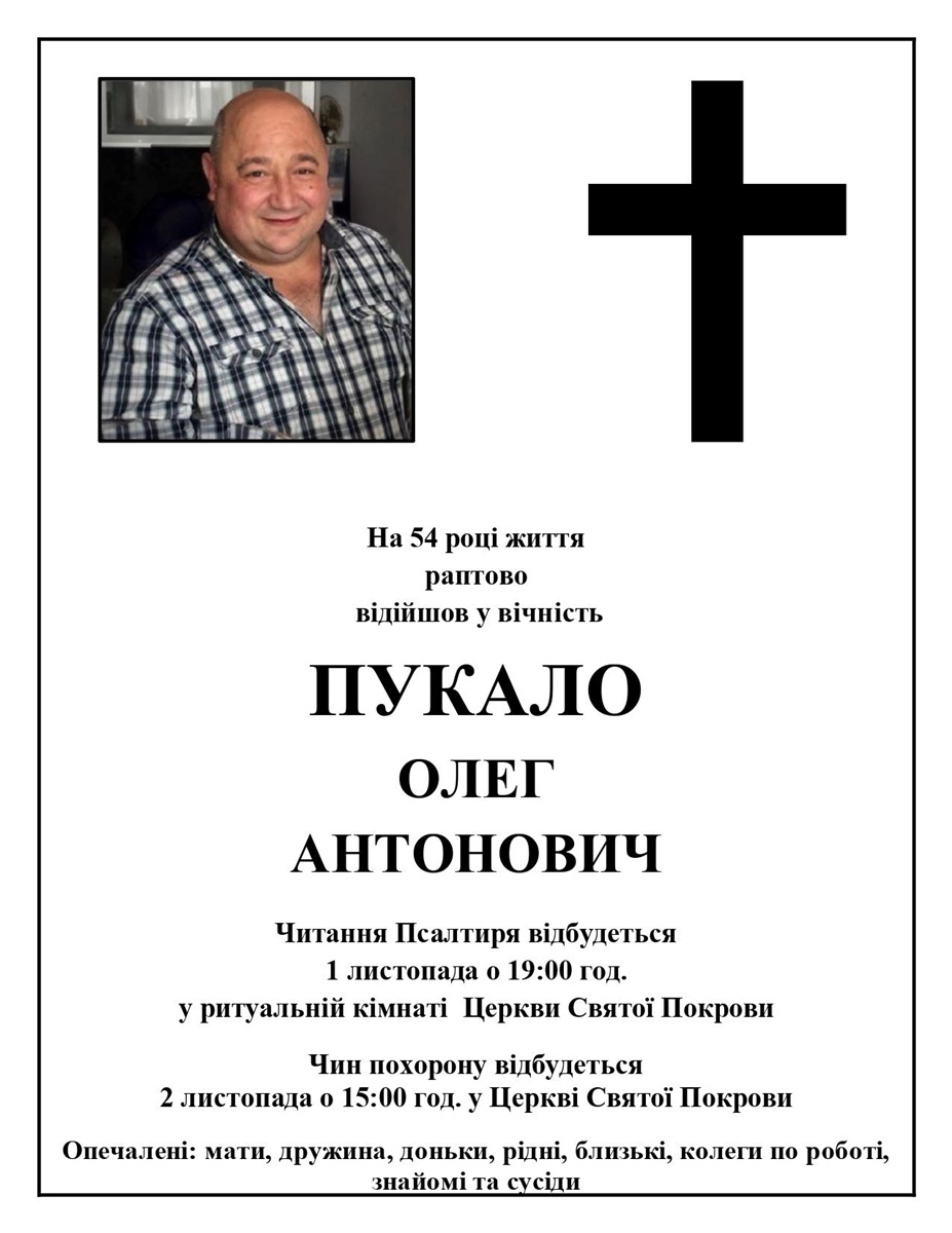 Сумну звістку повідомили рідні покійного в соцмережах. Похорон багаторічного керівника Чортківської залізничної станції Пукала Олега Антоновича, що спочив у Бозі на 54-му році життя, відбудеться у неділю, 2 листопада, о 15-й годині в церкві Святої Покрови міста Чорткова.