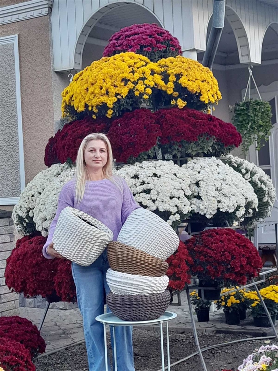 «Родзинкою» знайомства з квітникаркою Іриною Клим стало на лише вирощування квітів як таке. Бо цим нині нікого надто не здивуєш. Вона ще й власноруч виготовляє для пропонованої краси тару-«вдяганку». Йдеться про надзвичайно популярні тепер кошики зі штучного ротангу. Що таке ротанг? Як пояснює всезнаючий «дядько Гугл», це натуральний матеріал, отриманий з ліан тропічних ротангових пальм. Використовується для плетіння меблів, кошиків, інших предметів інтер’єру. Проте існує й штучний аналог, тобто синтетичний, створений з полімерів. Так от, штучний ротанг, з яким і працює наша майстриня, стійкий до вологи, ультрафіолету, перепадів температури та механічних пошкоджень, легко миється. Тепер ротангові вироби в тренді через доведену їхню практичність.