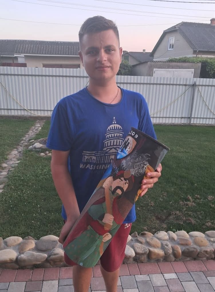 – Зараз Дмитру 15 років. Він в курсі всіх новин, патріотично налаштований, – продовжувала розповідати пані Ірина. – Він навіть тубус розмалював на міський аукціон. Удень вчиться, а вечорами, навіть до пізньої ночі, малює. Мабуть, тоді надходить найбільше натхнення. Окрім патріотичної воєнної тематики, на полотно лягає й релігійна. Дмитро читає Біблію, навіть мені деколи щось із неї тлумачить. У картинах переважають темні барви. Думаю, це все через думки, налаштованість сина щодо буремних подій в Україні. Дмитро не вчився художньому мистецтву, він – самоучка, проте дуже хоче глибше пізнати майстерність у маститих митців-художників. Кілька днів займає його робота над однією картиною.