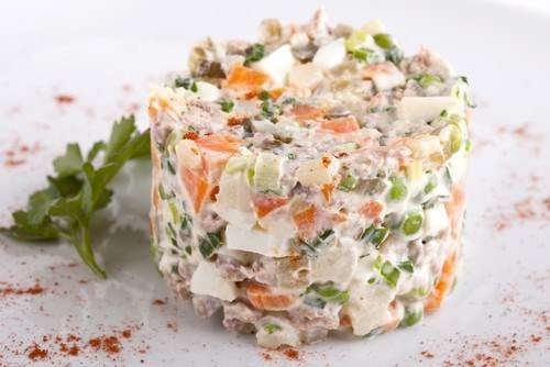 Отже, 300 г печериць слід нарізати кубиками і обсмажити. Звісно ж, остудити. Одну цибулину також обсмажити до золотистого кольору. Ще потрібно 4-5 відварених картоплин, 1 відварену моркву – так само нарізані дрібними кубиками. Відтак солоні огірки нарізаємо дрібними кубиками – 2-3 (кількість обираємо залежно від смакових уподобань). Сіль, перець – також до смаку. І плюс ще – консервований зелений горошок. Змішуємо всі ці компоненти і заправляємо пісним майонезом. Перед подачею можна прикрасити свіжою зеленню.